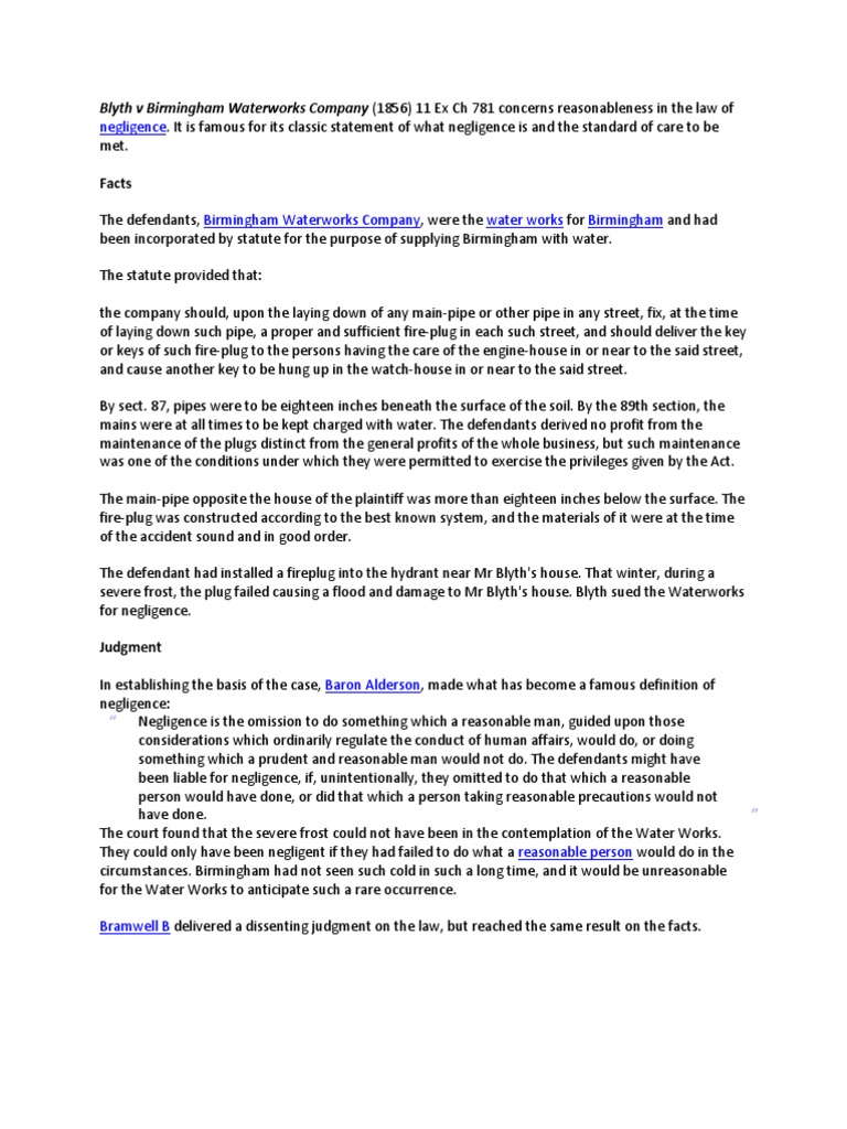 25 years after it was installed, the water main sprung a leak due to extreme frost. Birmingham water works (birmingham) (defendant) owned a nonprofit waterworks. Blyth v the company of proprietors of the birmingham waterworks. The court considered the standard of care in negligence in blyth v birmingham waterworks company and stated: 25 years after it was installed, the water main sprung a leak due to extreme frost. Negligence is the omission to do something which a reasonable man, guided upon those considerations which ordinarily regulate. A wooden plug in a water main became loose in a severe frost. The plug led to a pipe which in turn went up to the street. Blyth v birmingham waterworks company (1856) 11 ex ch 781 concerns reasonableness in the law of negligence. edit blyth v birmingham waterworks company. Court of exchequer, 1856 (pg. Jump to navigationjump to search. One of the plugs opposite p's house froze over and was damaged by an unusually cold frost.